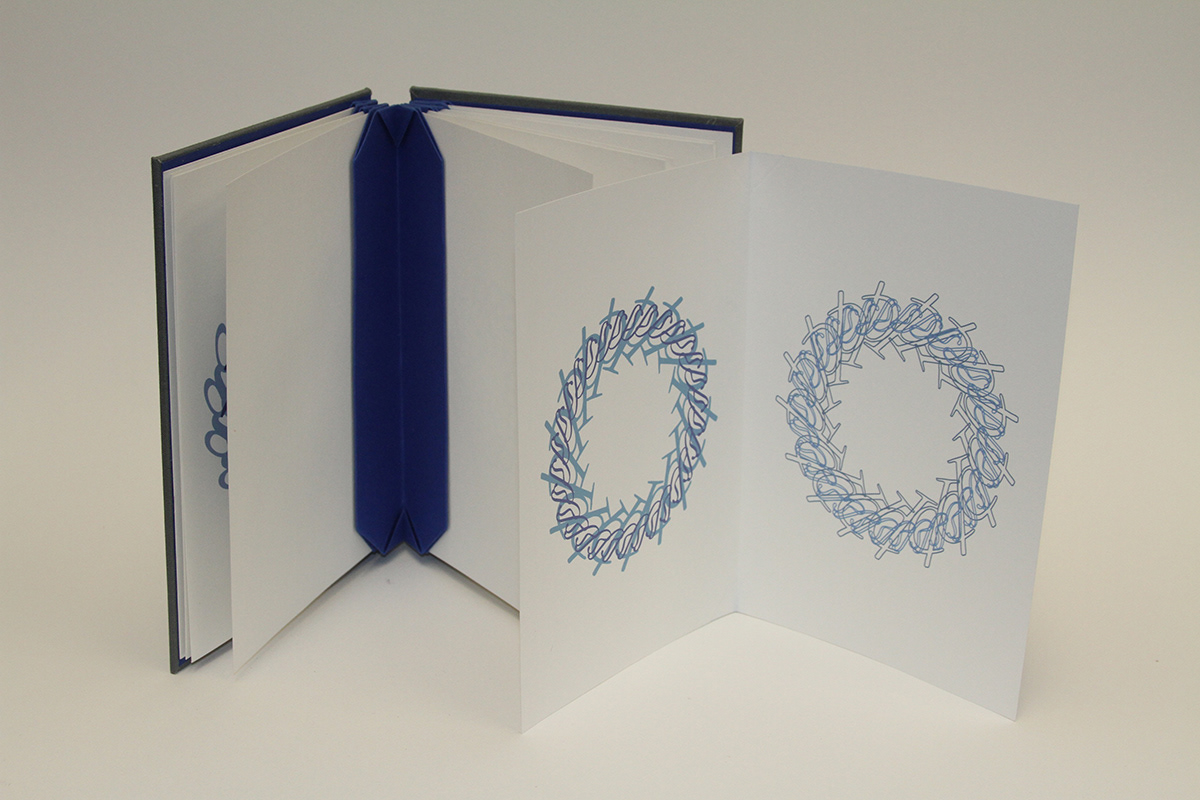 A Case-bound, blizzard binding specimen book. 6 unique typographic ornament specimens, printed on archival paper using Epson 4880 Ink Jet printer. Edition of 1.