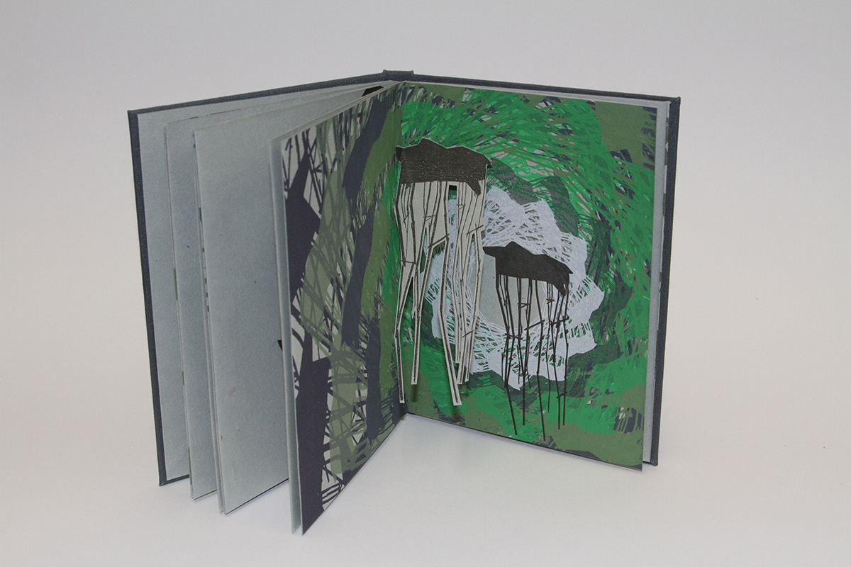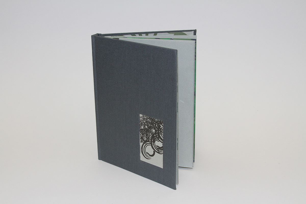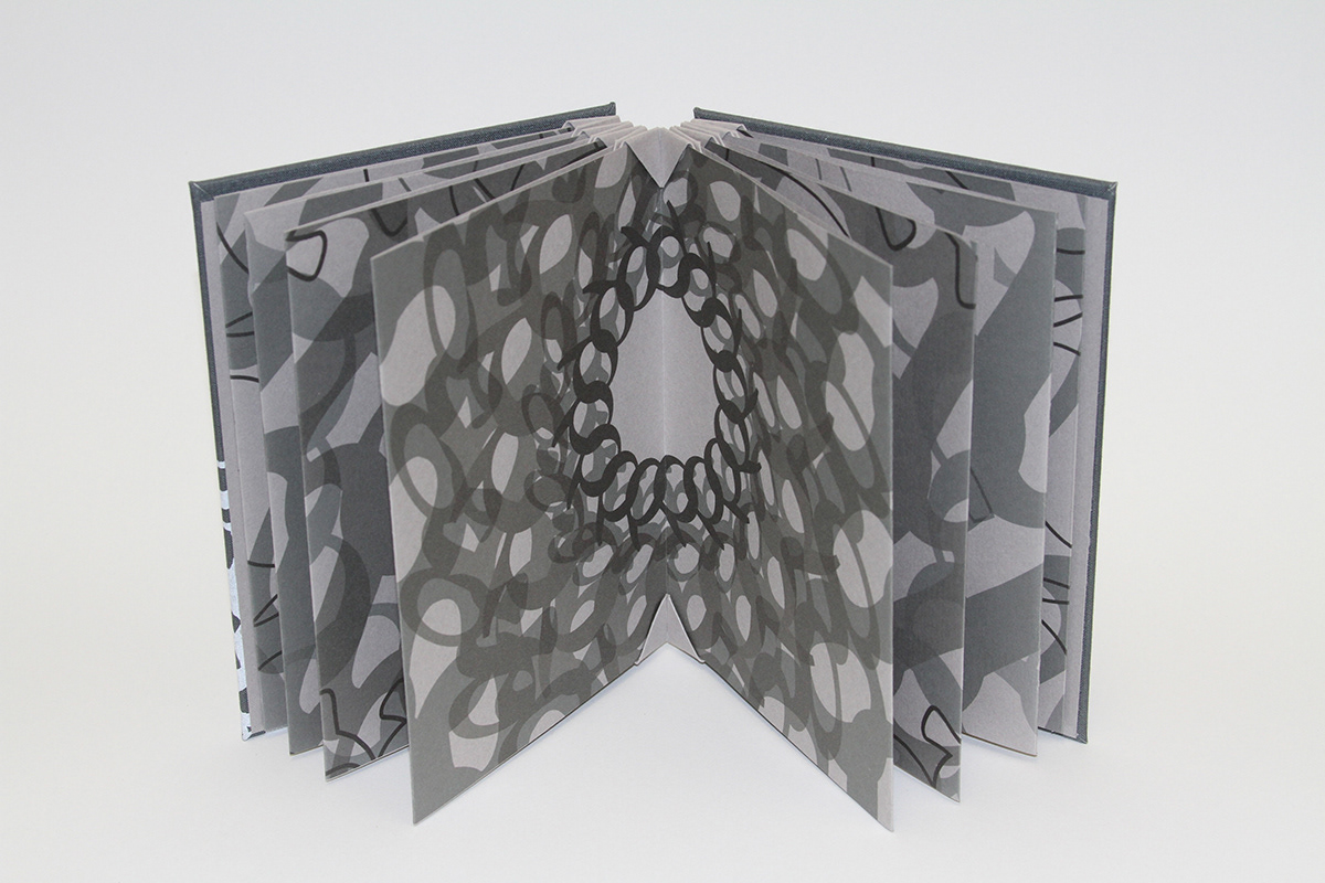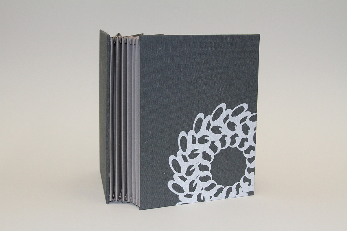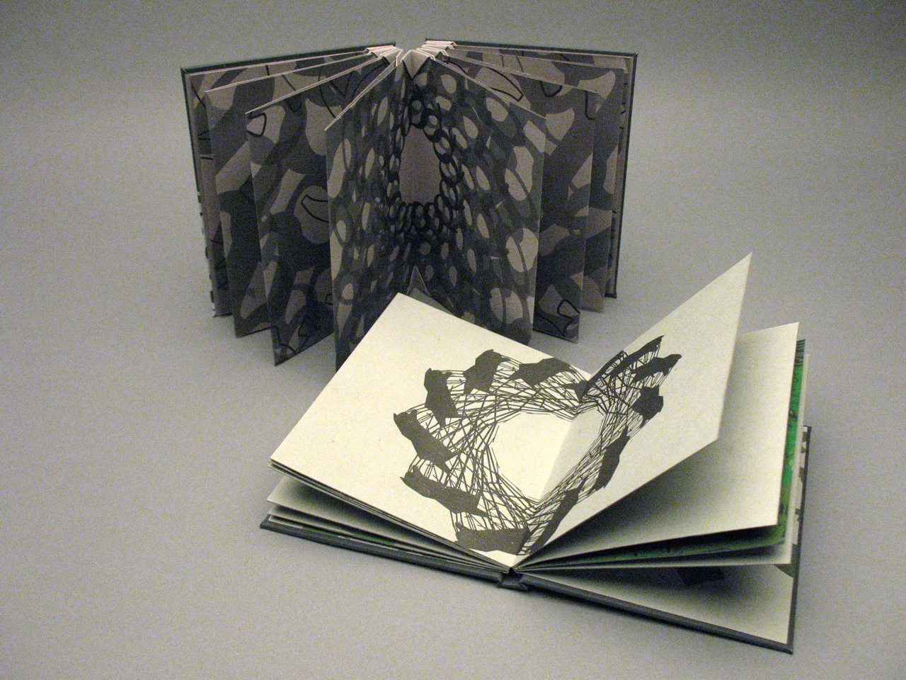 Case-bound Blizzard + Accordion binding for Book 1; Case-bound drumleaf for Book 2. Letter press printing, and Screen printing on handmade and machine made papers. Each book editions of 5.